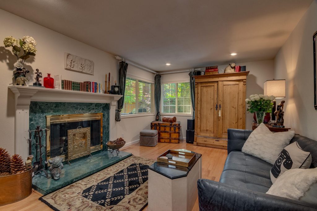 - The living room is cozy with a spectacular custom marble fireplace.
